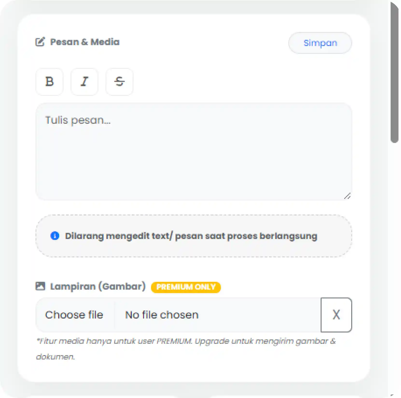 | Pesan dan Media - media tidak boleh melebihi 5Mb, rekomendasi Media (Hanya gambar, support format .PNG, .Jpg) |